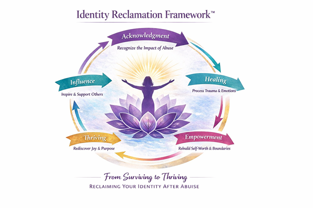 The Identity Reclamation Framework describes the psychological journey many women experience after leaving abusive relationships.